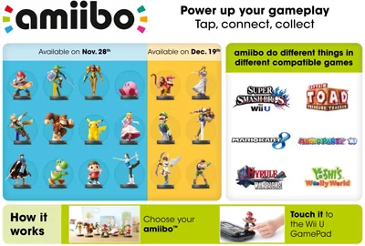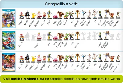Different compatible games will use amiibo in different ways. Super Smash Bros. for Wii U will be the first game to use amiibo™. Games like Mario Kart 8, Mario Party 10, Captain Toad: Treasure Tracker and Yoshi’s Woolly World are also planned to support amiibo™.