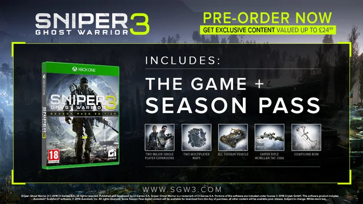 Pre-order now and get ready for a full season of amazing content with the Sniper Ghost Warrior 3 SEASON PASS. Sniper Ghost Warrior 3 Season Pass brings you access to the entire range of downloadable content by the end of 2017.